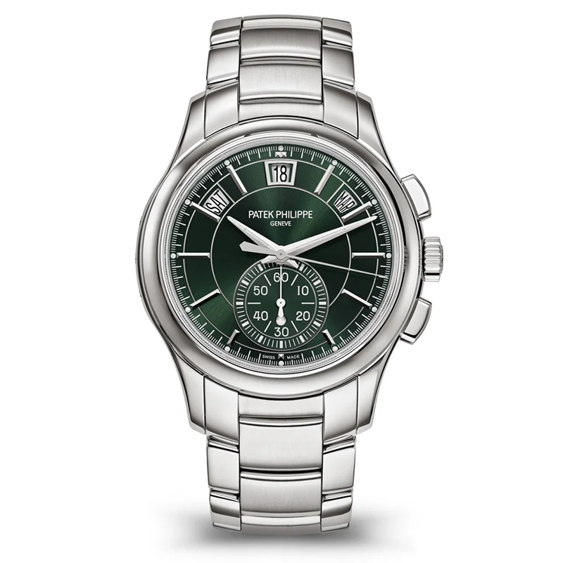 Available for the first time in steel, the Reference 5905 self-winding flyback chronograph with Annual Calendar radiates a resolutely sporty look. The rhythmic dial features an elegant and casual "sunburst" olive green colour. The integrated bracelet is enhanced by contrasting polished and satin finishes. Thanks to the vertical disk-type clutch, the central chronograph seconds hand can be used as a permanent (running) seconds display. The patented Annual Calendar automatically takes account of 30- and 31-day months, requiring only one correction per year, on March 1st.