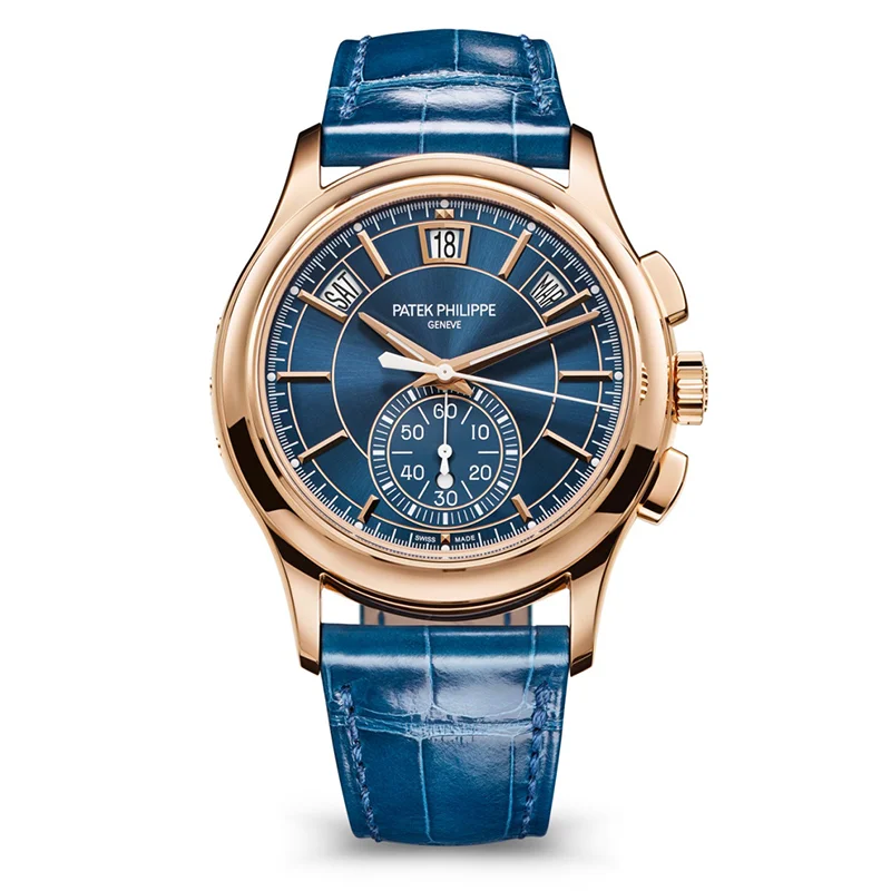 Representing a combination of two popular Patek Philippe complications, the self-winding flyback chronograph with Annual Calendar, Reference 5905, comes in a new rose gold version with a sunburst blue dial – a modern and elegant color accentuating the timeless style of this flagship model.