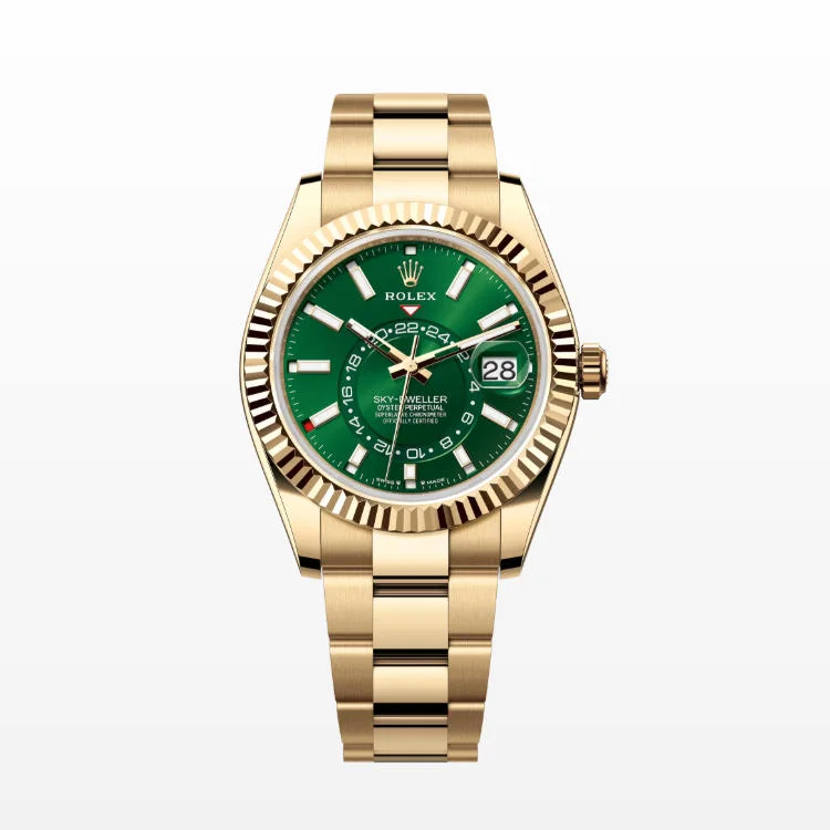 The Rolex fluted bezel is a mark of distinction. Originally, the fluting of the Oyster bezel had a functional purpose: it served to screw the bezel onto the case, helping to ensure the waterproofness of the watch. It was therefore identical to the fluting on the case back, which was also screwed onto the case for waterproofness, using specific Rolex tools. Over time, the fluting became an aesthetic element, a genuine Rolex signature feature. Today the fluted bezel is a mark of distinction, always in gold. The Sky-Dweller is equipped with a mechanism of interaction between the rotatable bezel, the winding crown and the movement: the Ring Command system, which allows the user to select the watch's functions one-by-one and to set them easily, quickly and securely.